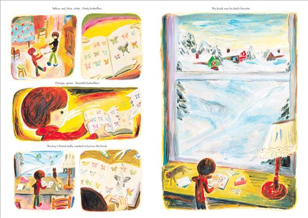 After accidentally ripping the pages of his father's favorite book, a pensive, heavy-hearted boy leaves his cozy, warm house to ski through the snow.