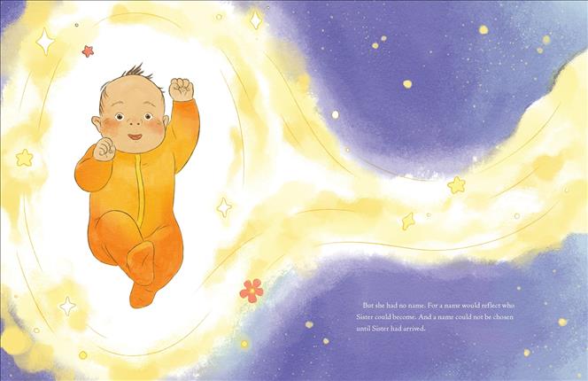 Other - 03/09/2026 In Cheng and Diao’s fantastical romp rooted, per an author’s note, in "the elemental meanings behind Chinese words," an older sibling is the wide-eyed witness to an extraordinary naming ritual. As an infant, Sister has "toes like grains of rice... hair as dark as sesame sweets," but no name. Early one morning following the baby’s birth, the Chinese family is visited by a teller, a gray-haired elder who explains that the arrival of five spirits, "each with gifts to offer," will inform the infant’s name. One by one, beings representing fire, earth, gold, water, and wood appear with arrayed offerings. Earth Spirit, for example, furnishes "warm dirt; a tuft of wild-dog hair; and sweet, crunchy potato puffs" along with a blessing: "May she have the honesty and stability of Earth." Digitally rendered domestic scenes provide a neutral backdrop for luminous spirits described in incantatory prose, rendering a traditional process tinged with hopes and dreams. Ages 4-8. (Mar.) - Copyright 2026