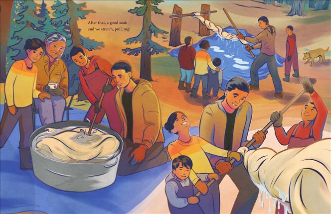Other - 10/27/2025 An Indigenous community works together to tan a large hide by hand in this captivating portrait of joyful collaboration. Making her picture book debut, Aleut-Alutiiq author Iceberg employs animated, sometimes humorous language, enlivening a step-by-step set of instructions into a jubilant account that starts with giving thanks and ends with using the final material. After Auntie leads a blessing, the large group scrapes the hide ("till our hands are raw"), soak and stretch it ("Pull, tug!"), beat it on each side ("We’re back, drumming"), and layer on both urine ("Next, we pee on it!/ PEE! Yep, all of us!") and a stew made of the animal’s brain ("Plop the brain in the pot-/ let’s get it nice and hot"). Pencil and digital illustrations from M?tis artist Donovan (Borders) employ saturated colors as the smiling contemporary group, wearing warm layers, take part in the multistep process. Together, text and image offer a sense of communal care as "from these hands, old to new,/ a tradition of love passes through," resulting in "a good hide." An author’s note offers further context. Ages 4-8. (Jan.) - Copyright 2025