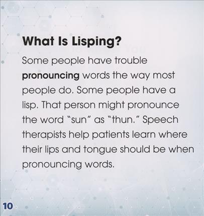 Talking and communicating with others can be difficult for some, but there are many health care professionals trained to give them proper treatment. Speech therapists are health helpers! They work with people of all ages. They often work one-on-one with patients, which helps patients focus and feel cared for at the same time. Speech therapists are experts in language, speech sounds, communication, and more.