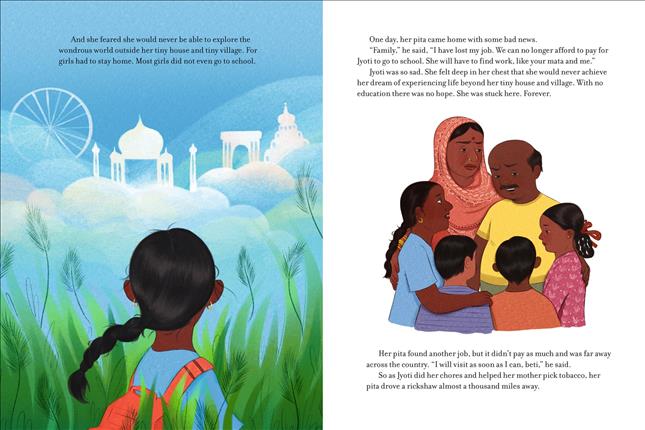 Other - 11/24/2025 In an uneven tale of perseverance and survival, Thomas and Raj chronicle the 2020 journey of then-teenage Jyoti Kumari, who, as Covid-19 breaks out across India, pedals more than 700 miles on a secondhand bicycle to transport her injured migrant-worker father home. The creators repeat Kumari’s mantra-"It’s a little hard, but not a lot"-as the teen, with her beloved Pita on the back of the bike, draws strength from elephants and tigers, gods and goddesses. Across saturated scenes, Joshi’s lushly rendered digital illustrations incorporate Indian motifs and Hindu iconography: Kumari and her father are lulled to sleep by Vayu, the wind god, and Kumari "fills herself with the aag of Kali," the goddess of time and destruction. Alternating between English and Hindi, urgent third-person text acknowledges the determination behind an act that, in the end, "was very hard.... But means a lot." Extensive back matter offers necessary context. Ages 4-7. (Jan.) - Copyright 2025