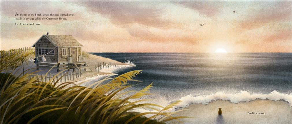At the tip of the beach where the land slips away is the Outermost House, home to the Outermost Mouse. The house-proud little mouse loves her life at the edge of the waves. The sand is warm and soft and the night is filled with stars. And she loves her house, a nest of nooks and crannies decorated by a jam-jar of posies and a clock that tick-tocks her to sleep at night.